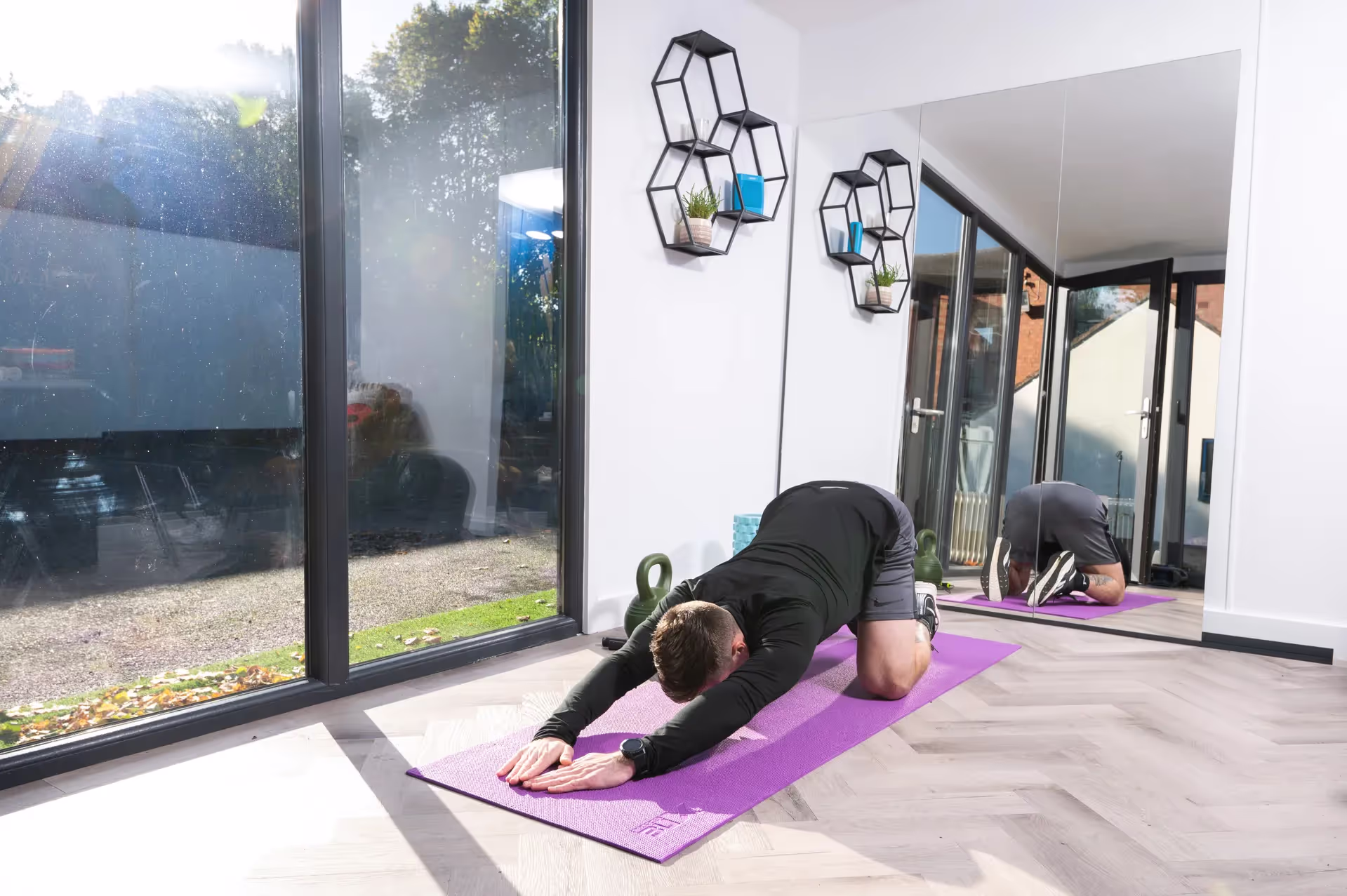 The internal fit-out was complete to a very high specification including light grey Herringbone LVT flooring, a painted feature wall and mirrored side walls to facilitate personal training and gym use. Our 4600mm total length corner UPVC glazed system was used in colour RAL 7016 to complement the cladding and provided a single fully glazed door with tilt and turn window / door combination to let an unbelievable amount of light into the space.
